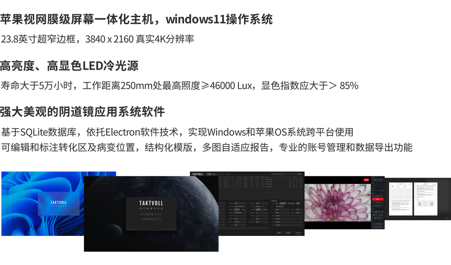 | 软件管理系统 | 能够对检查全过程的图像进行采集、显示、冻结、储存、删除等操作。可进行姓名、年龄、病种、日期等查询方式。脚踏板、快捷键、鼠标点击多种控制采集方式。具有阴道镜血管分布增强显影处理功能,即对影像进行过滤变换处理在滤除组织粘液同时,清晰显现手细血管形态及收缩功能。提供对比分析,具备测量功能,如病灶周长、面积的参数,具备加注标识(如活检检查)和 RC1 评估功能、国际标准。提供年、季、月统计功能。 |