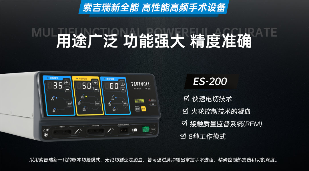 ES-200PK是一款具有8种工作模式的多功能高频手术设备,其中单极电切模式3种,单极电凝模式3种,双极模式2种,几乎满足外科多种手术电刀合一的便捷性,同时其内置接触质量监督系统,监测高频漏电流,为外科手术提供安全。